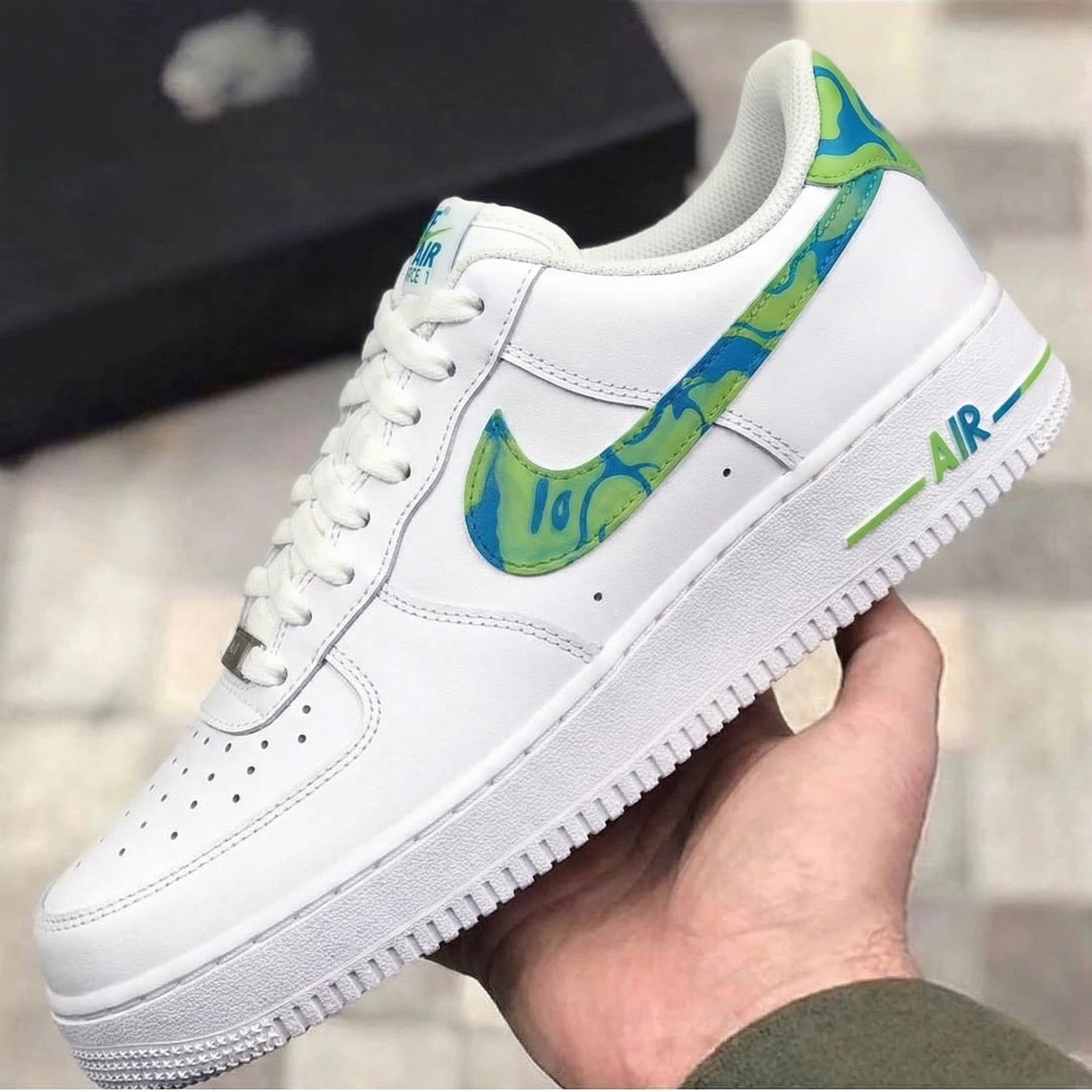 Step into playful style with these Custom AF1! 🌿💙 A vibrant green & blue marble pattern on the Swoosh, toe, and heel pops against the sleek white leather base. Perfect for streetwear lovers, these Custom shoes (Custom Sneakers too!) blend Air Force 1’s iconic comfort with unique, hand - crafted charm. Hit the streets or chill with friends—these kicks add artistic flair to any look, and no two pairs are identical (just like your personality)! 👟✨