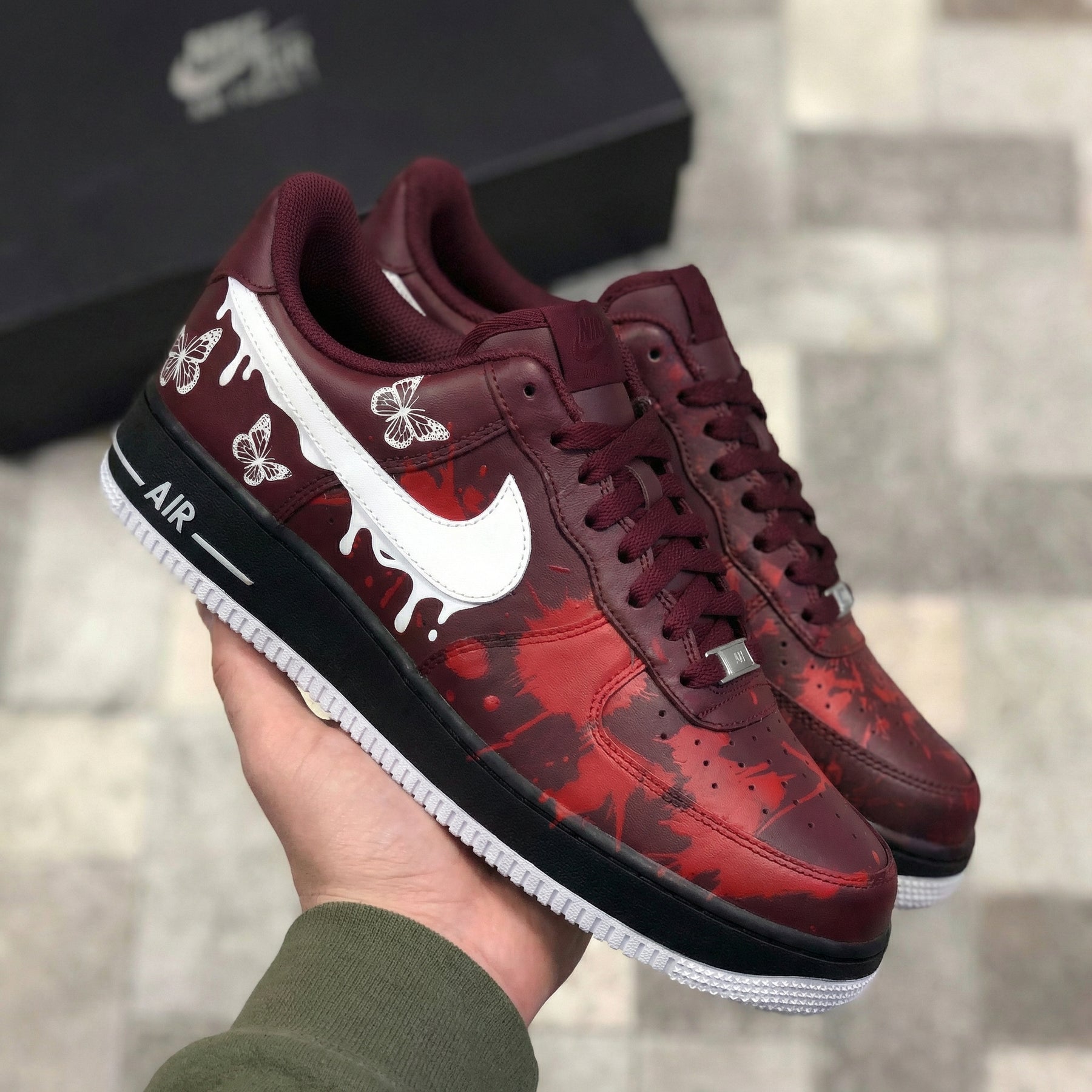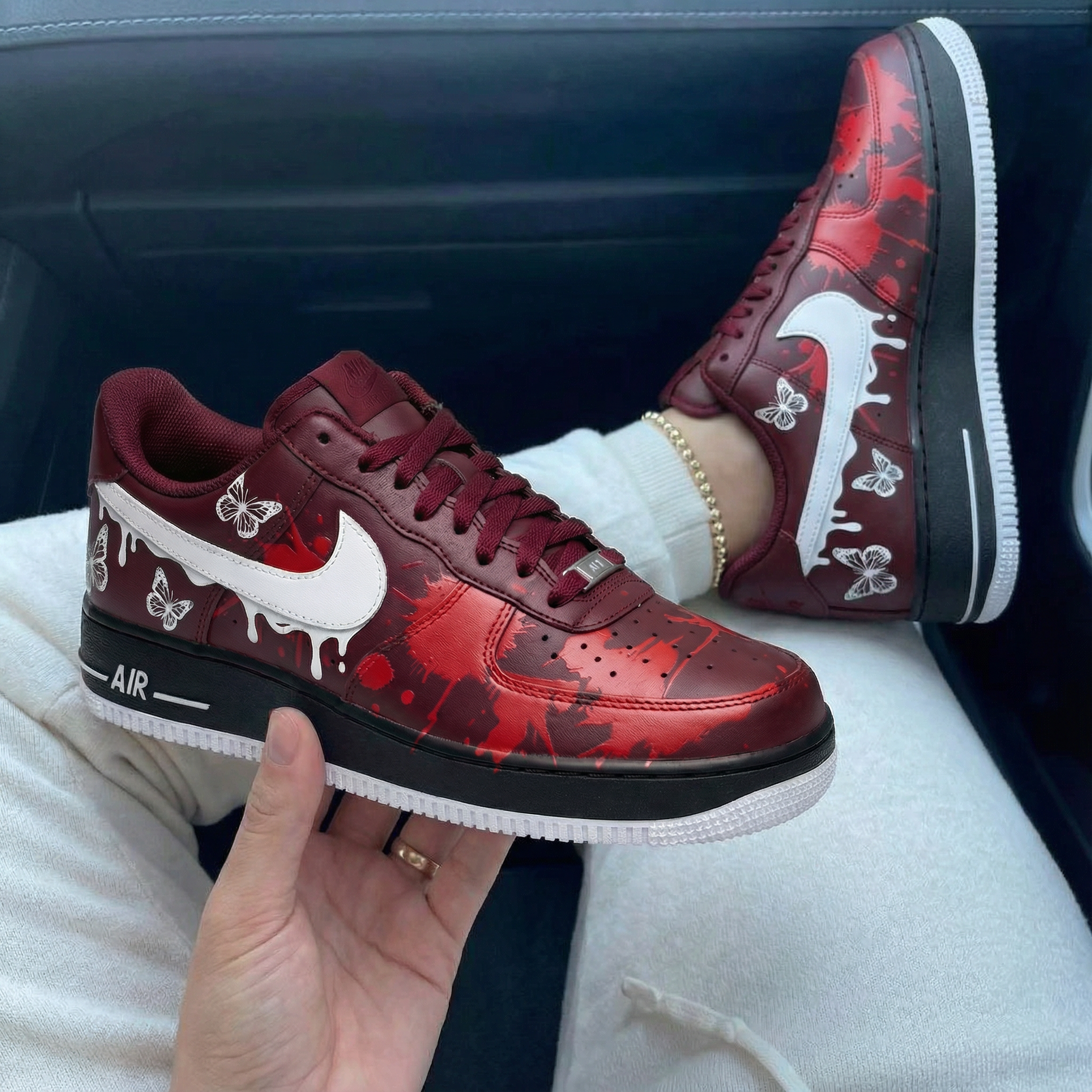 Step up your sneaker game with these one - of - a - kind Custom AF1s! These custom shoes feature a stunning maroon red base, splashed with bold red accents that give them an edgy look. The white Nike swoosh drips artistically, adding a touch of street - art flair. And let's not forget the delicate butterflies fluttering across the sides, bringing a feminine and whimsical touch. Whether you're hitting the streets or just hanging out, these custom sneakers are sure to turn heads and make a statement.