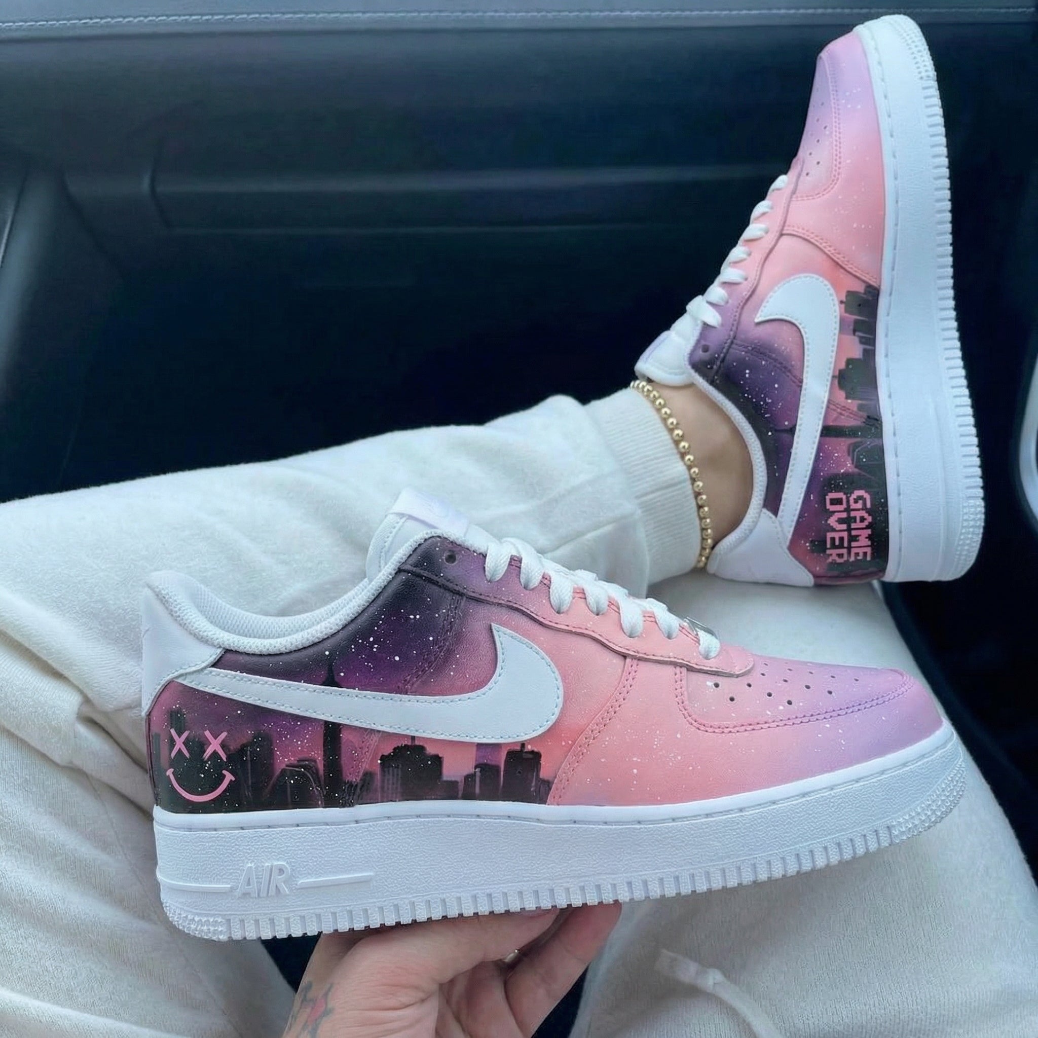 Step up your sneaker game with these one - of - a - kind Custom AF1s! These Custom shoes are a true head - turner, featuring a stunning silver and purple colorway with a galaxy pattern that makes you feel like you're walking among the stars. The LV logo accents add a touch of luxury and style. And with playful elements like the "GAME OVER" text and smiley - face motifs, they're full of character. Whether you're hitting the streets or just hanging out, these Custom Sneakers are the perfect way to express your unique personality. Don't miss out on this exclusive pair!