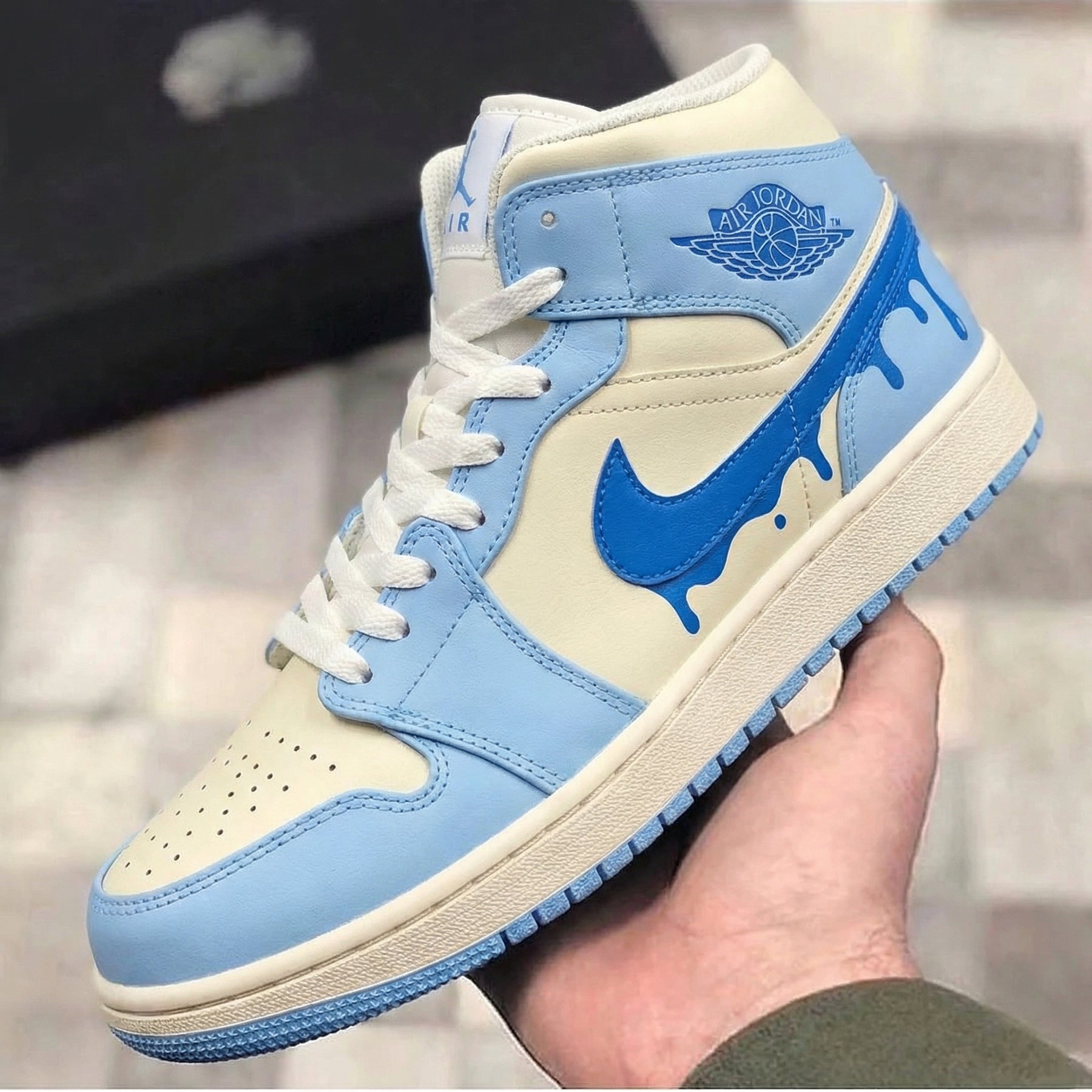 Step into whimsy with these **Custom AJ1** Baby Blue Cream Drip Swoosh! 🌊 Soft baby blue meets creamy tones, plus a *dripping* Swoosh (like melted treats on your kicks!) for playful charm. Smooth leather, classic AJ1 style, and bold art make these **Custom shoes** (and **Custom Sneakers**!) a standout. Perfect for street vibes, lazy days, or flaunting your unique flair—comfort + creativity, all in one! Your feet (and your style) will thank you.