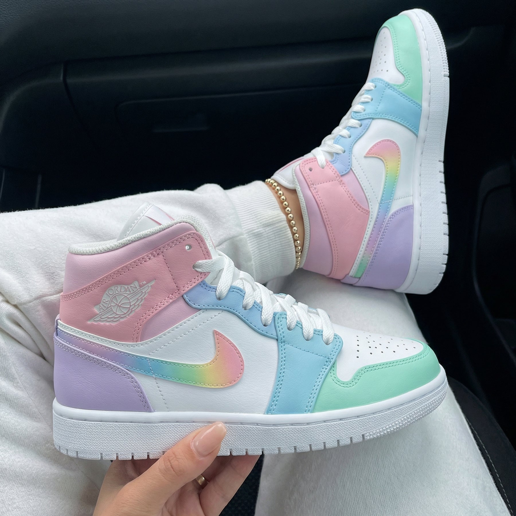 Step into style with these one - of - a - kind Custom AJ1s! Featuring a dreamy palette of baby pink, baby blue, and a rainbow - hued swoosh, these custom sneakers are a visual treat. Each pair is meticulously crafted to bring a pop of color and personality to your footwear collection. Whether you're hitting the streets or just hanging out, these custom shoes are sure to turn heads. Made for those who dare to be different and love to stand out in a crowd. Don't miss the chance to own these uniquely designed Custom AJ1s!