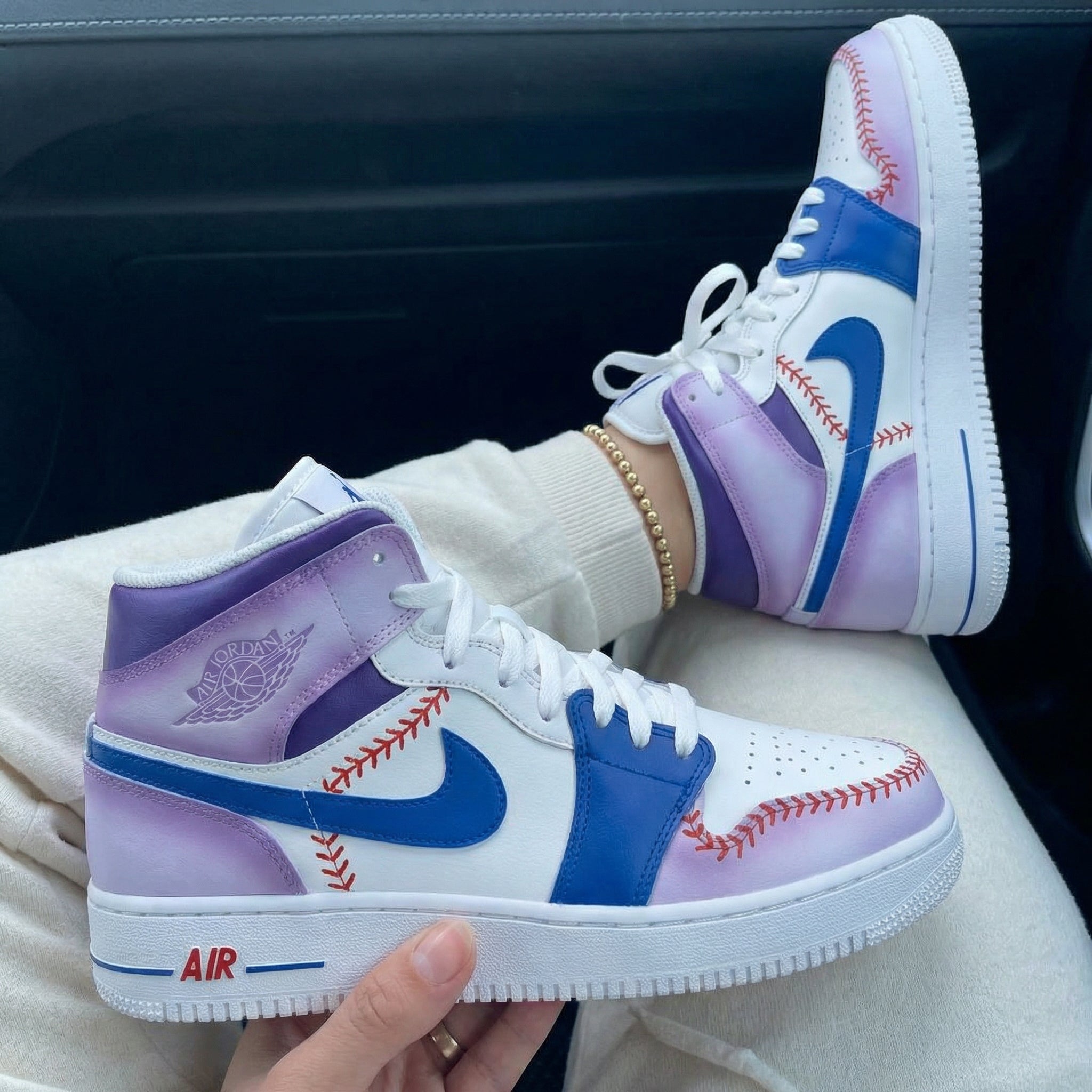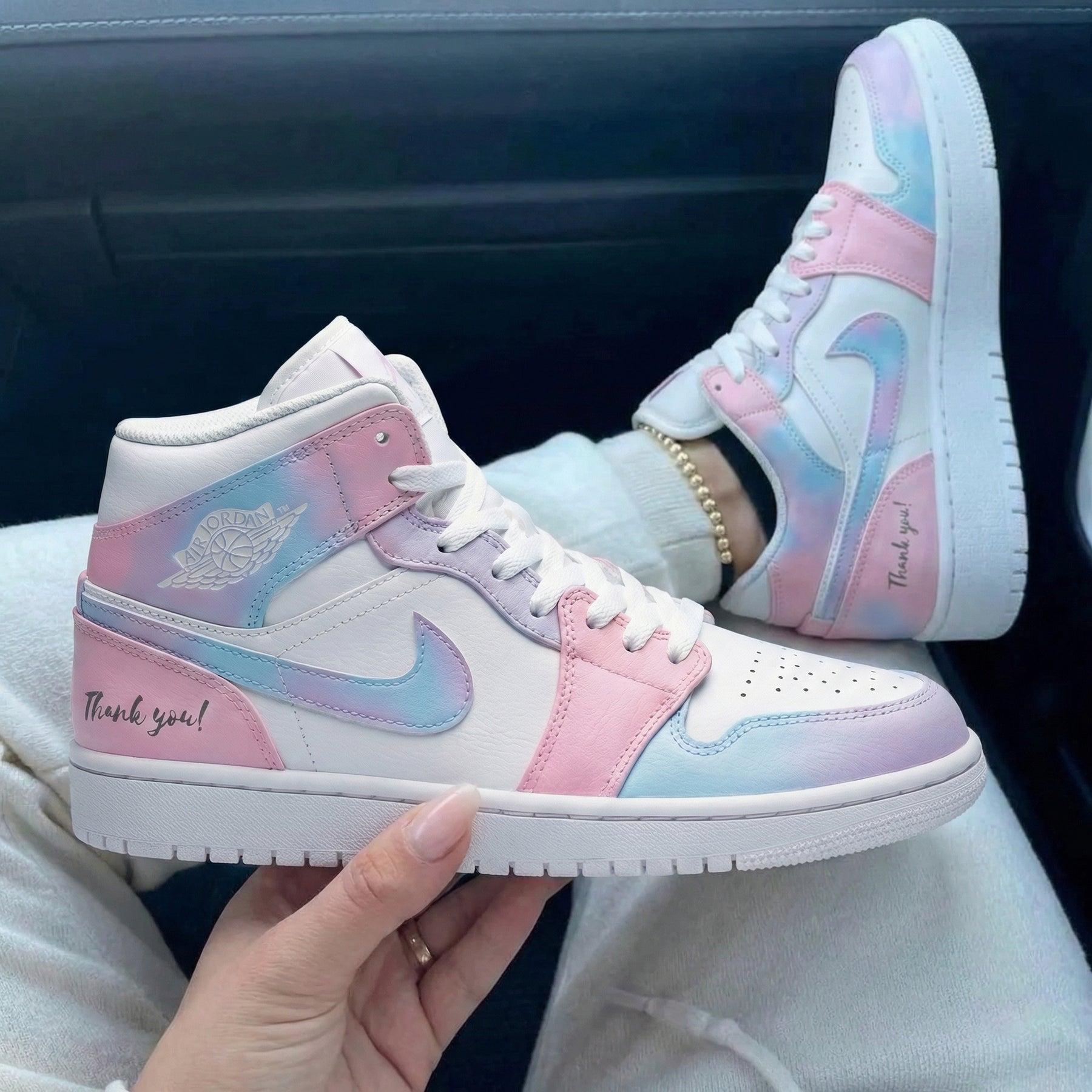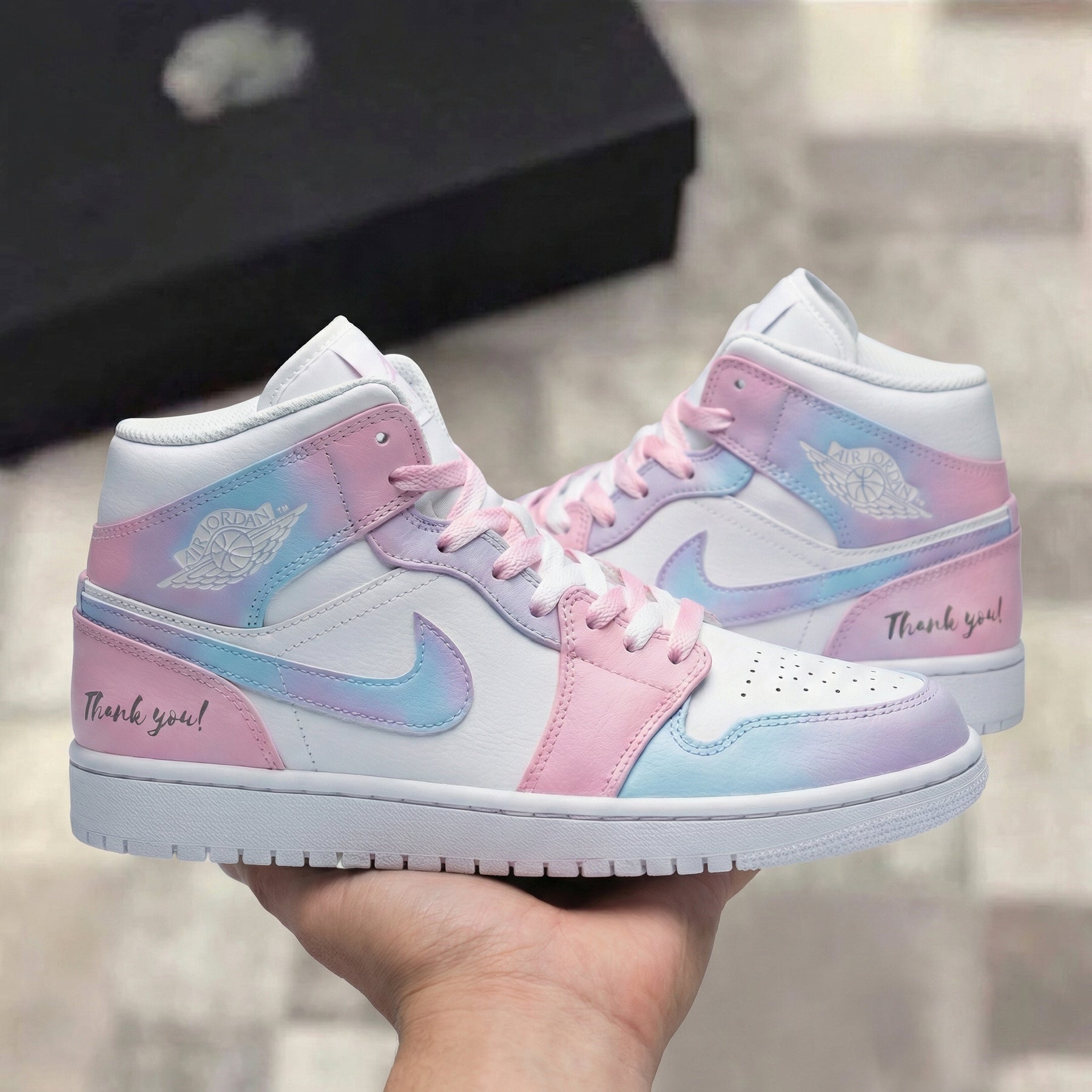 Hey sneakerheads! Check out these amazing Custom AJ1s. The soft baby pink and baby blue color - ways blend together beautifully, creating a dreamy, eye - catching look. With the sweet "Thank you!" message on the side, these custom sneakers are not only stylish but also carry a warm sentiment. Whether you're a collector or just want to stand out, these one - of - a - kind kicks are a must - have. Upgrade your sneaker game with these unique custom shoes!