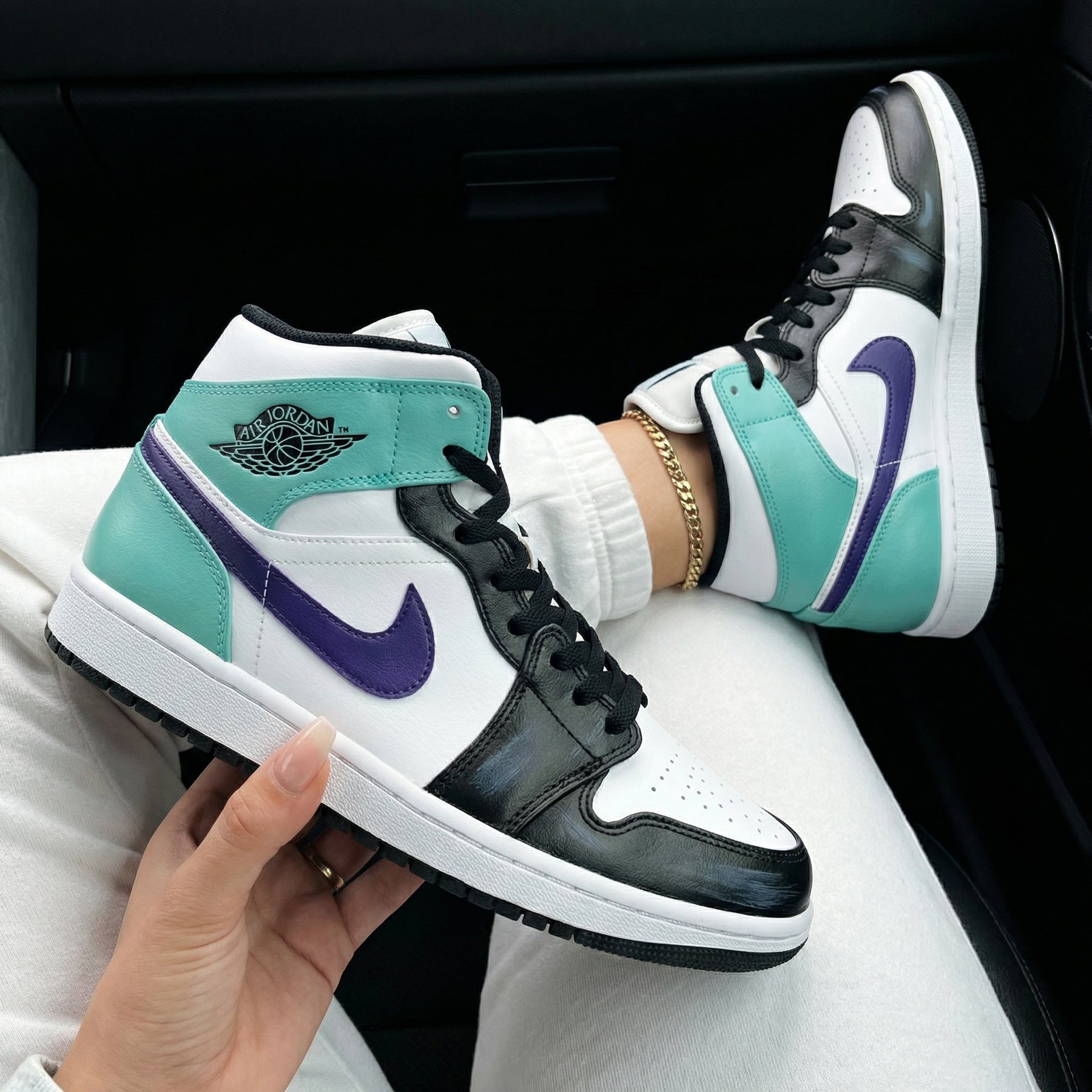 Hey sneakerheads! Check out these sick Custom AJ1s! These custom shoes are a fresh take on the classic Air Jordan 1, featuring a unique color - combo of black, white, teal, and purple. The sleek design with contrasting colors makes them stand out in any crowd. Whether you're hitting the streets or just chilling with friends, these custom sneakers are the perfect blend of style and comfort. Upgrade your sneaker game with these one - of - a - kind kicks!