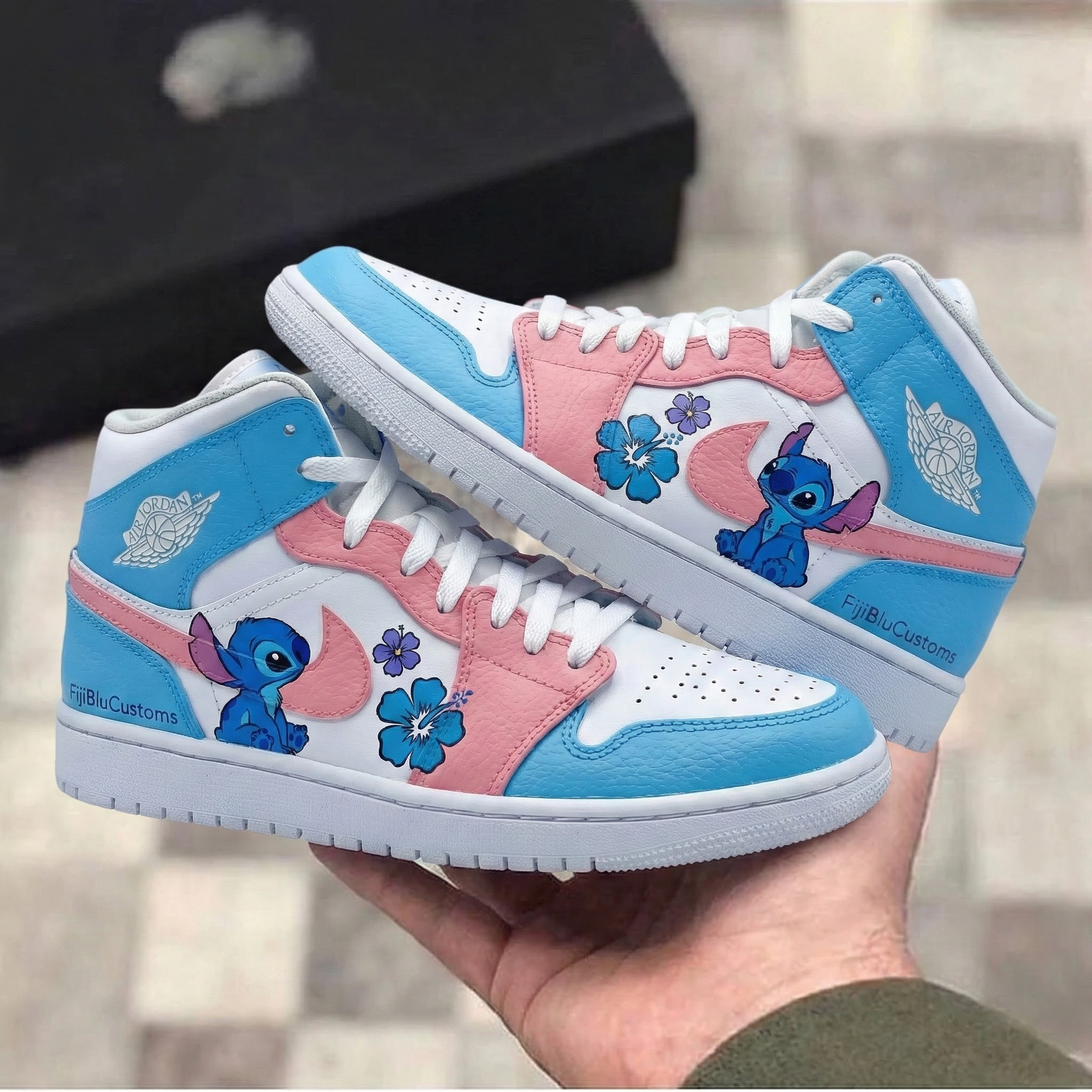 Step into whimsy with these Custom AJ1 Blue Pink Stitch Hibiscus sneakers! A dreamy mix of baby blue, soft pink, and crisp white, plus adorable Stitch & vibrant hibiscus blooms for playful charm. Crafted with smooth leather, these Custom shoes (aka Custom Sneakers) blend AJ1’s classic vibe with Disney - inspired flair—perfect for adding fun to every step!