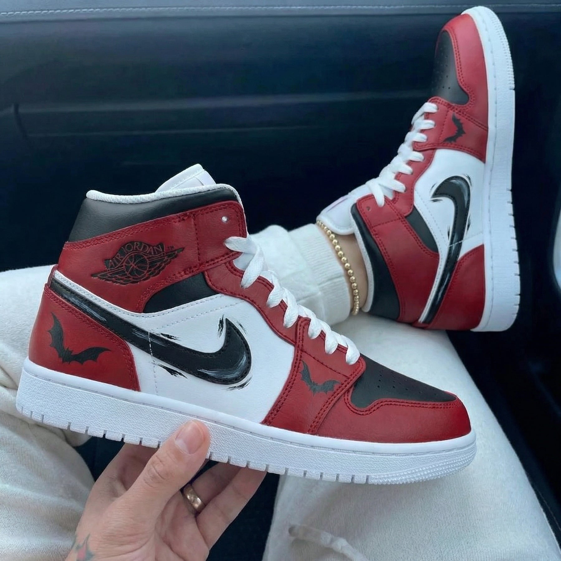 You really think you can step out without turning every single head? C’mon, be real. These Custom AJ1, custom shoes, custom sneakers feature a bold red, black and white colorway with edgy bat details, instantly cranking up any basic outfit to full main character energy. Stop blending into the crowd. Grab your pair now and let your vibe lead the way!