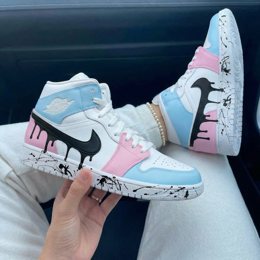 Custom Air Jordan 1 Baby Blue Pink with Dripping Black Pattern