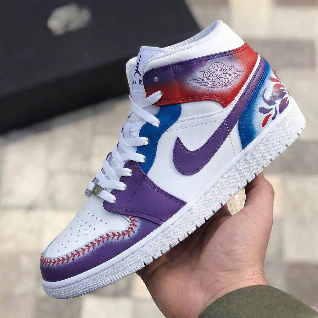 Custom Air Jordan 1 White Purple Blue Baseball Stitch Pattern