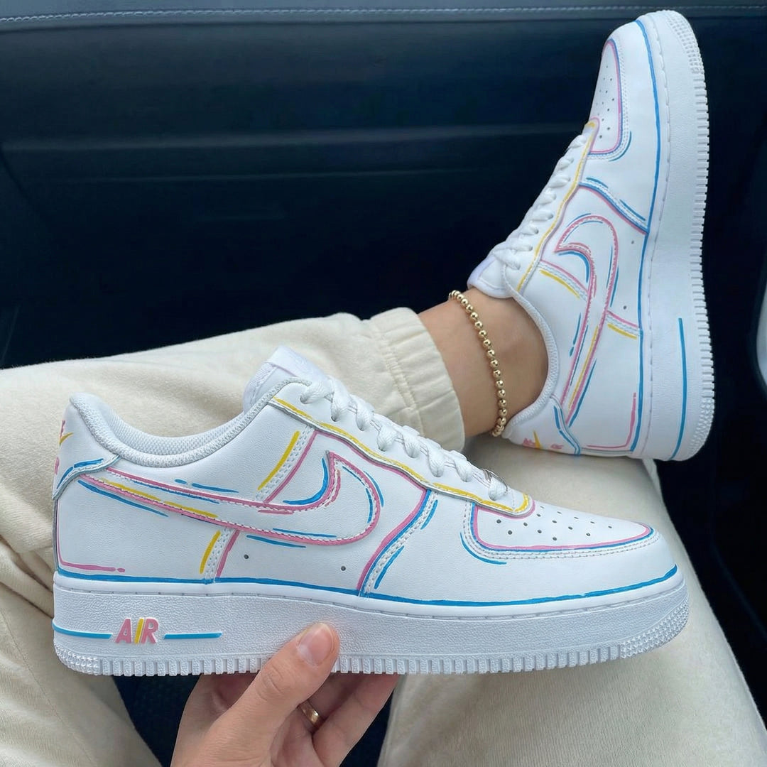 Custom Air Force 1 Baby Pink Blue Yellow Outline