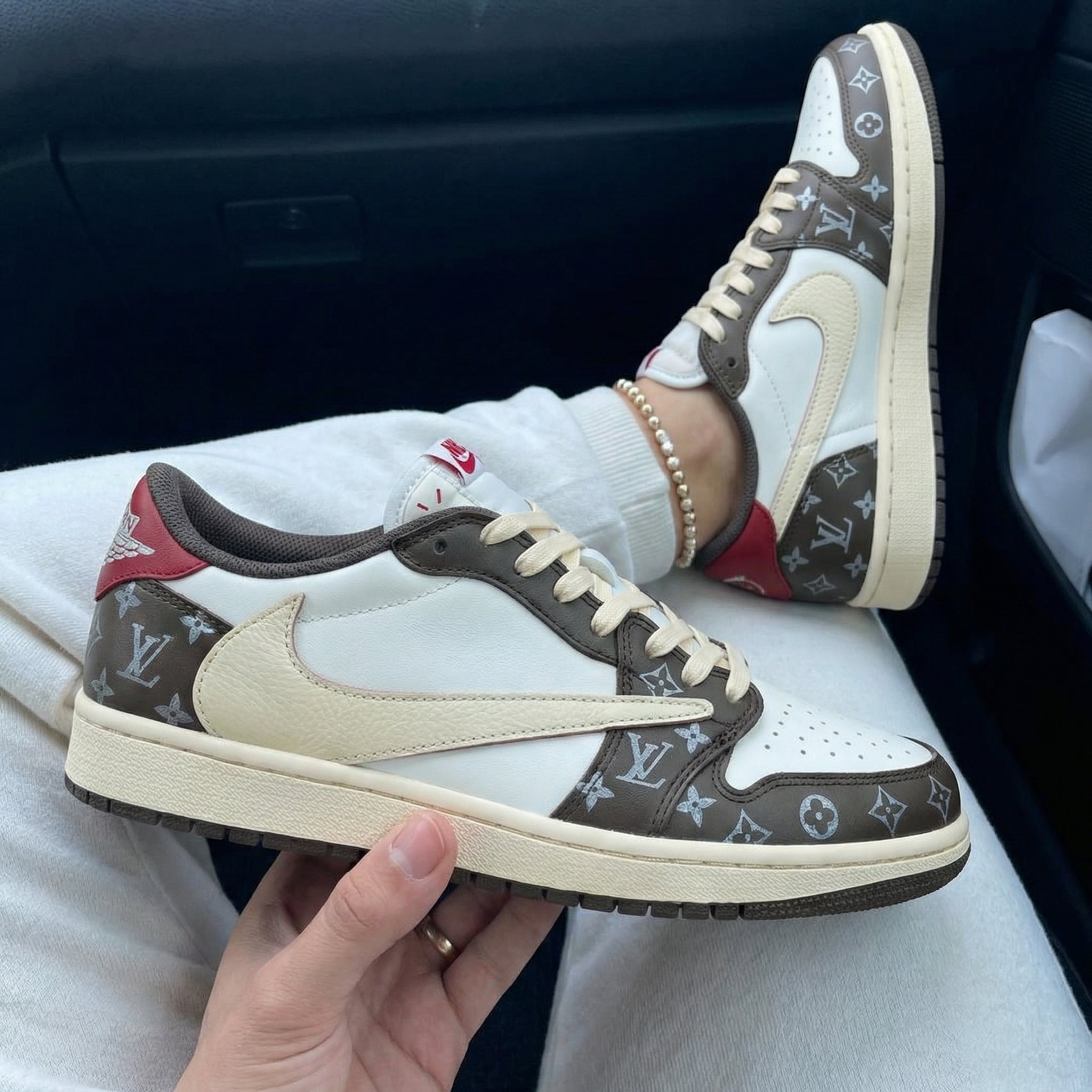 Hey sneakerheads! Check out these sick Custom AJ1s. Inspired by Travis Scott, they rock a baby - pink and black colorway with the iconic LV pattern. The contrast of the white base, black Swoosh, and pink LV - printed panels is straight fire. Whether you're a fan of Travis Scott or just love unique kicks, these custom shoes are a must - have. They're not just sneakers; they're a statement piece. Step up your sneaker game with these one - of - a - kind Custom Sneakers!