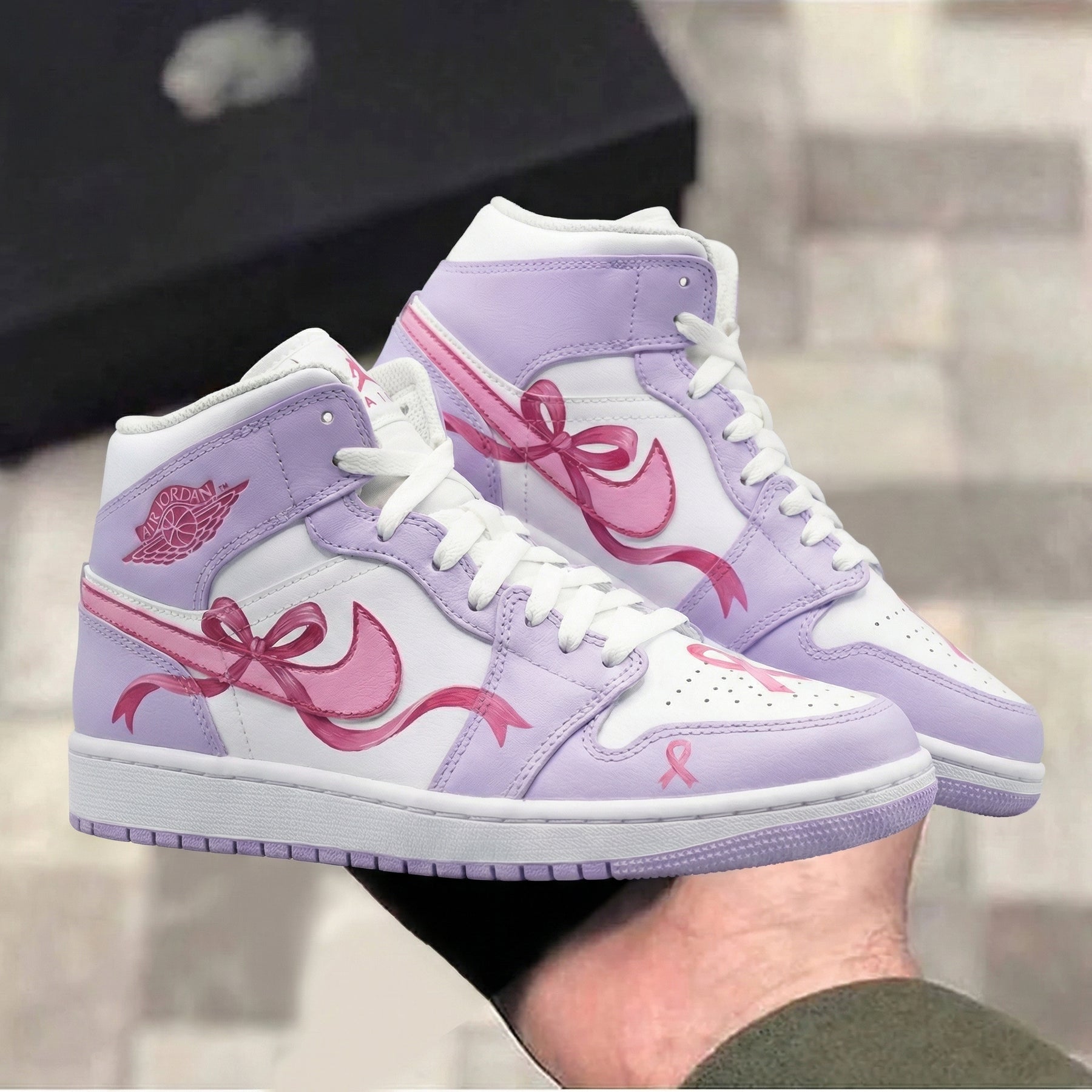Step up your sneaker game with these eye - catching Custom AJ1s! The soft baby purple and white colorway is perfectly accented by playful pink ribbons and bows. Each pair is a unique piece of wearable art, a true statement in the world of custom sneakers. Whether you're hitting the streets or just hanging out with friends, these custom shoes will make you stand out. They're not just sneakers; they're an expression of your fun - loving style. Get your hands on these one - of - a - kind Custom AJ1s now!